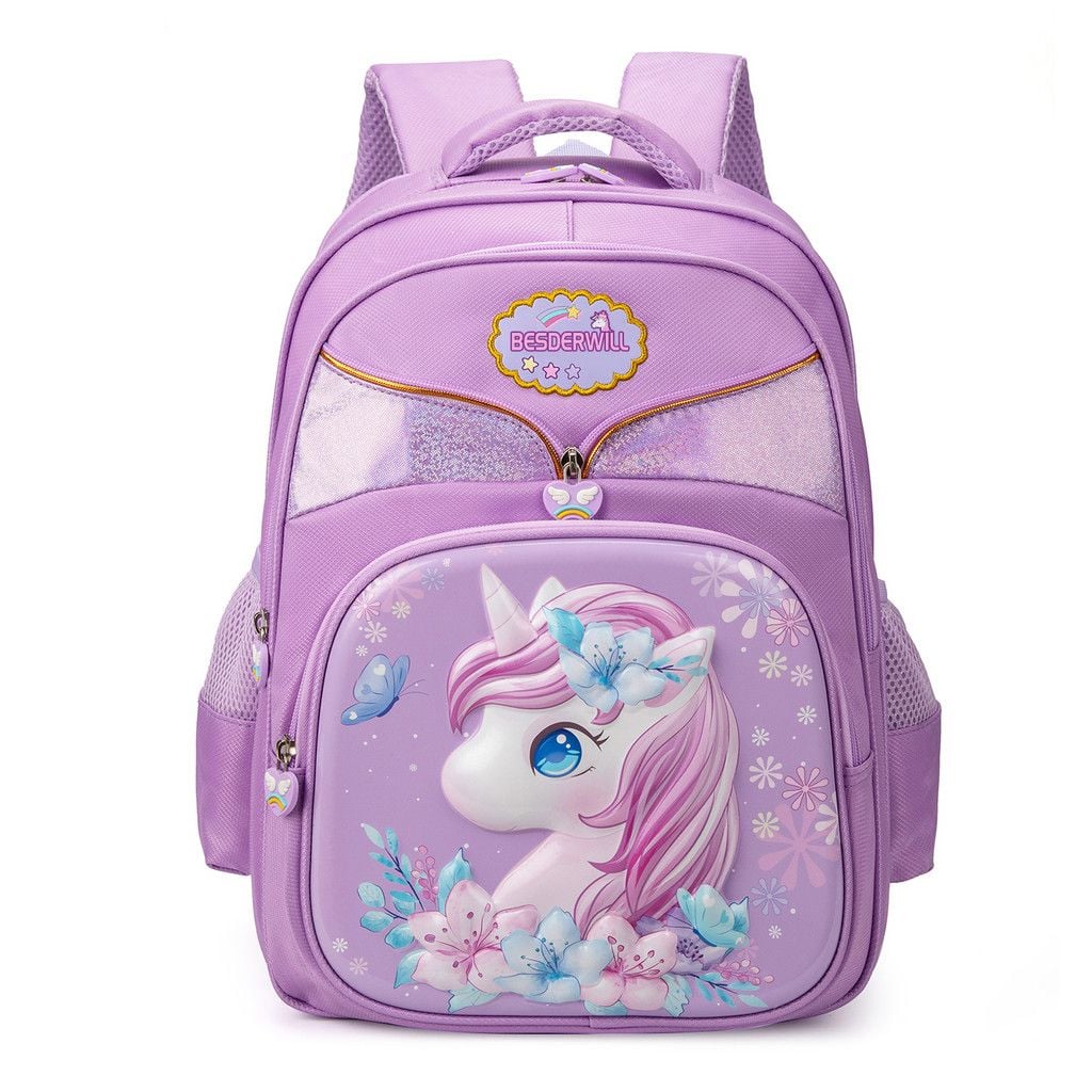 Ba lô học sinh Besderwill thiết kế hình kỳ lân 3D đáng yêu, màu sắc tươi sáng phù hợp cho bé gái tiểu học và trung học cơ sở. Chất liệu vải Oxford cao cấp chống thấm nước, dễ vệ sinh và giữ màu lâu.