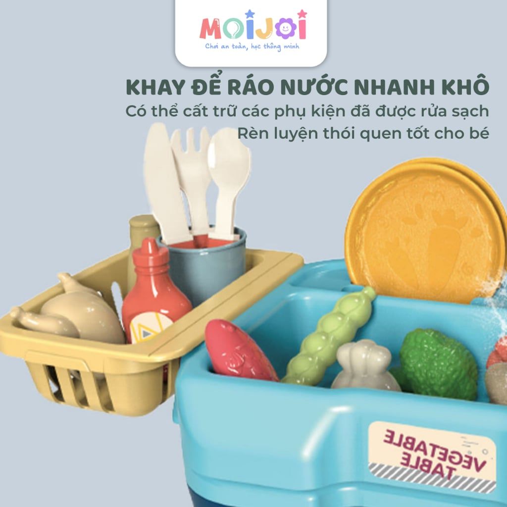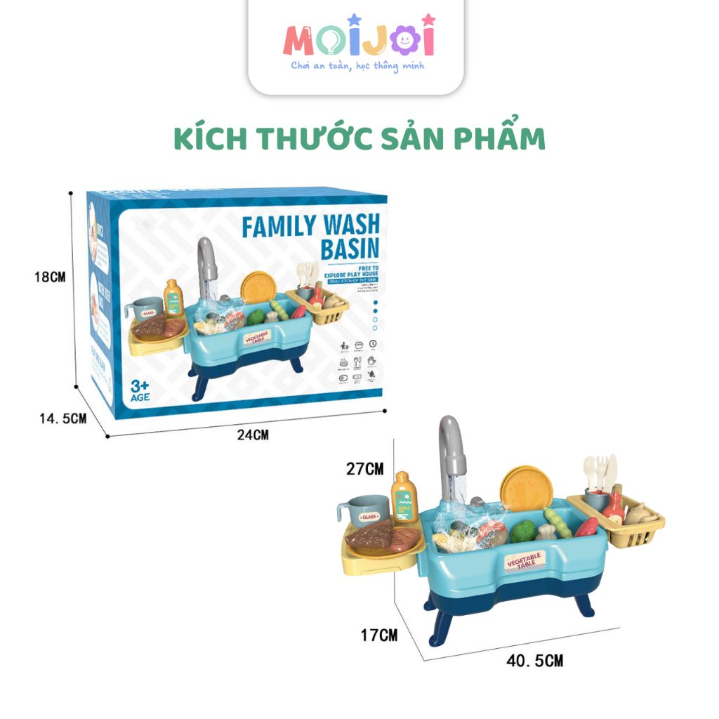 Bộ chậu rửa mini Family Wash Basin mô phỏng sinh động khu vực rửa bát với vòi nước chảy thật, giúp bé trải nghiệm cảm giác “rửa rau – rửa bát – phân loại đồ” như người lớn. Bộ đồ chơi đi kèm nhiều phụ kiện như rau củ, bát đĩa, dao muỗng… giúp bé phát triển kỹ năng vận động tinh, nhận diện đồ vật và rèn luyện tính tự lập.
