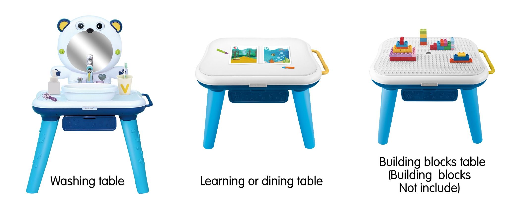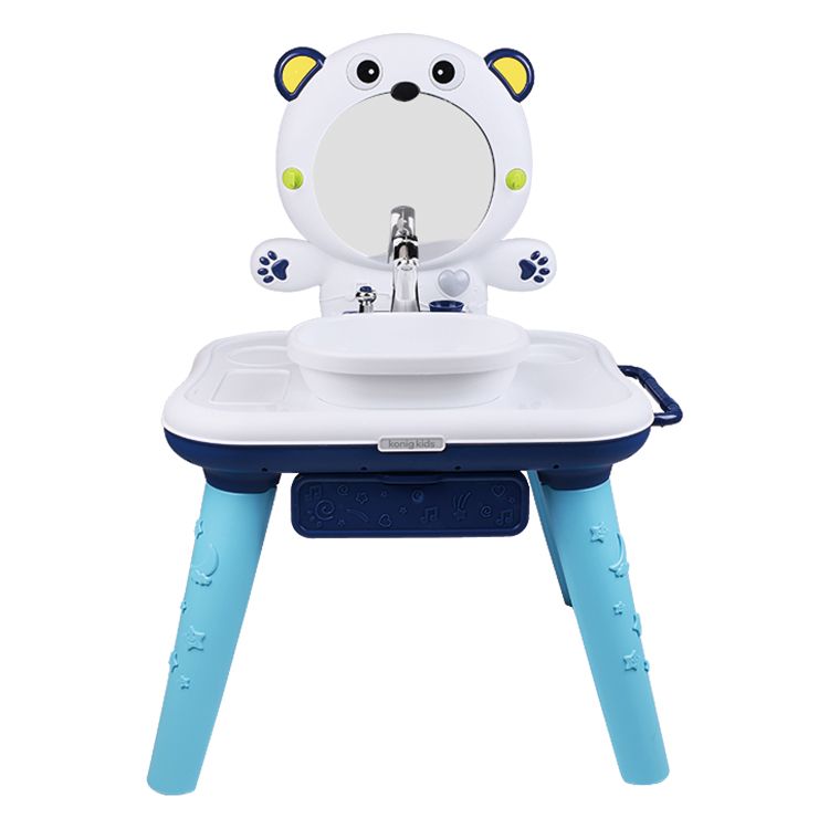 Giúp bé yêu học cách tự lập và rèn luyện thói quen vệ sinh cá nhân với bàn rửa mặt mini hình gấu màu xanh dễ thương. Sản phẩm được thiết kế phù hợp chiều cao trẻ nhỏ, tích hợp gương an toàn, vòi nước mô phỏng và chậu rửa để bé vừa chơi vừa thực hành các hoạt động vệ sinh như rửa tay, đánh răng, chải tóc.