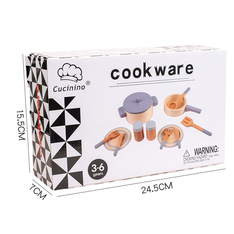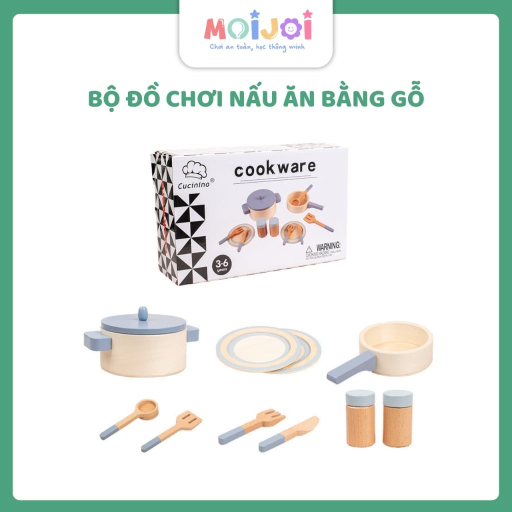 Bộ đồ chơi dụng cụ nấu ăn bằng gỗ tự nhiên – Nồi, chảo, chén dĩa và muỗng, an toàn cho bé
