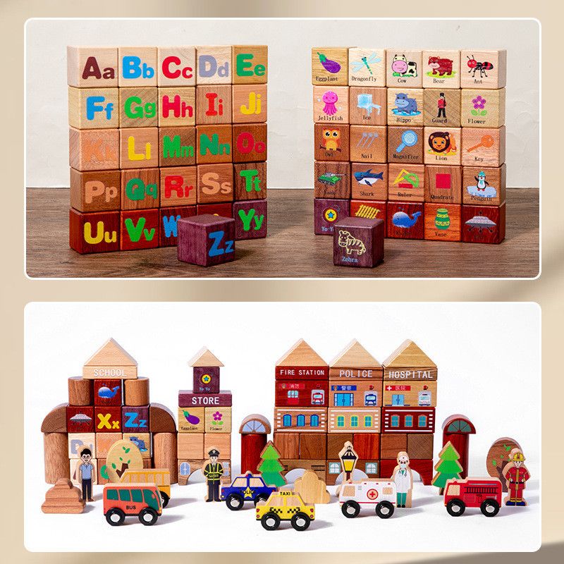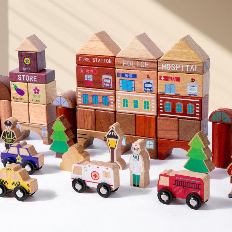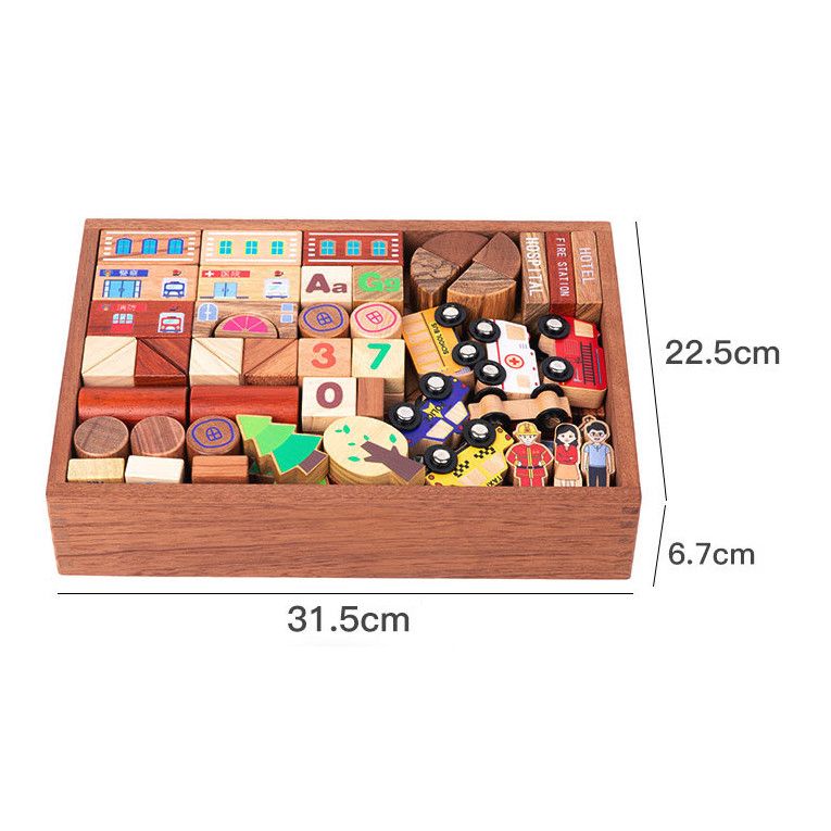 Sản phẩm được làm từ gỗ tự nhiên cao cấp, bề mặt nhẵn mịn, sơn màu an toàn gốc nước, không chứa chất độc hại, đảm bảo an toàn tuyệt đối cho trẻ. Ngoài ra, bộ khối còn được bổ sung mô hình xe, cây, biển báo giao thông, giúp trò chơi thêm sống động và khuyến khích bé học hỏi về đời sống xung quanh.