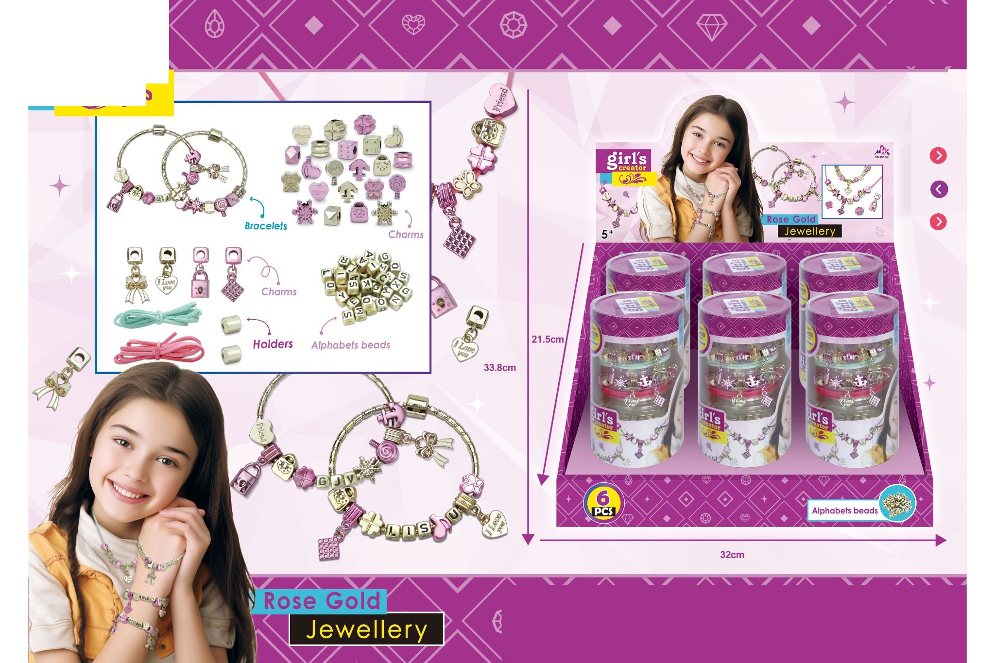 Hộp Charm Bracelets: 34 × 25.5 × 4.5 cm (8 vòng tay)