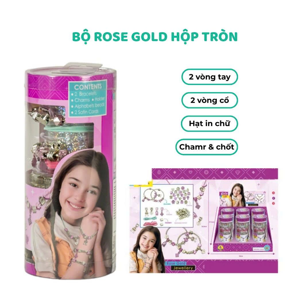 Hộp tròn Rose Gold: đường kính 8 cm, chiều cao 17.5 cm (2 vòng tay & 2 vòng cổ)