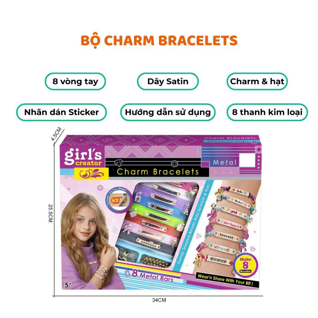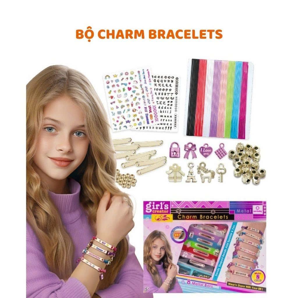 Bộ đồ chơi DIY làm vòng charm trang sức cho bé gái giúp bé tự tay sáng tạo vòng tay, vòng cổ theo phong cách riêng. Thông qua việc xâu hạt, gắn charm và phối màu, bé có thể tạo ra những món trang sức xinh xắn để đeo hằng ngày hoặc làm quà tặng cho bạn bè, người thân.