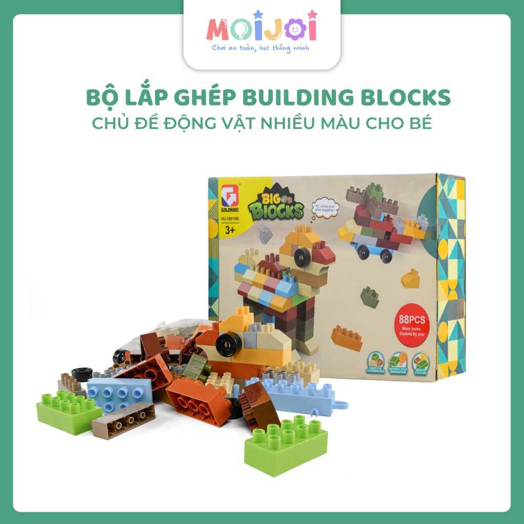 Bộ lắp ghép Building Blocks 49 chi tiết giúp bé tạo hình các loài động vật như voi, hươu cao cổ, cá sấu… với màu sắc tươi sáng và kích thước viên gạch lớn, dễ cầm nắm. Bộ đồ chơi hỗ trợ bé phát triển tư duy logic, khả năng sáng tạo và kỹ năng vận động tinh. Chất liệu nhựa an toàn, bề mặt láng mịn phù hợp cho bé từ 3 tuổi trở lên.