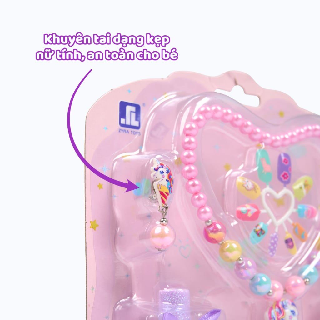 Set phụ kiện đầy đủ: bao gồm dây chuyền, bông tai, nhẫn, vòng tay, nhẫn dán móng tay và 2 lọ sơn móng tay dễ rửa.