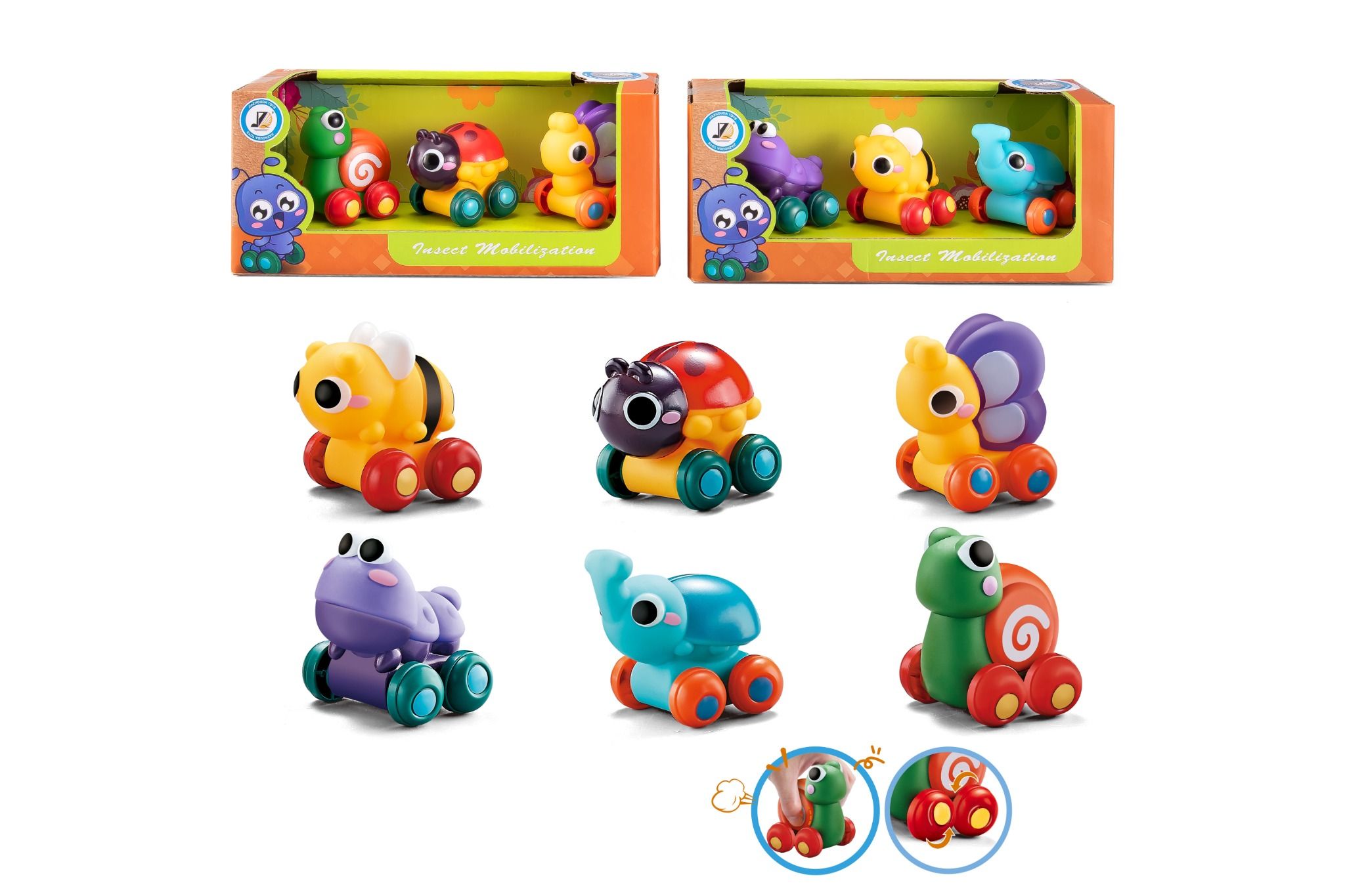 Thiết kế mô phỏng 6 loài động vật: ong, bọ rùa, bướm, hà mã, voi và ốc sên.