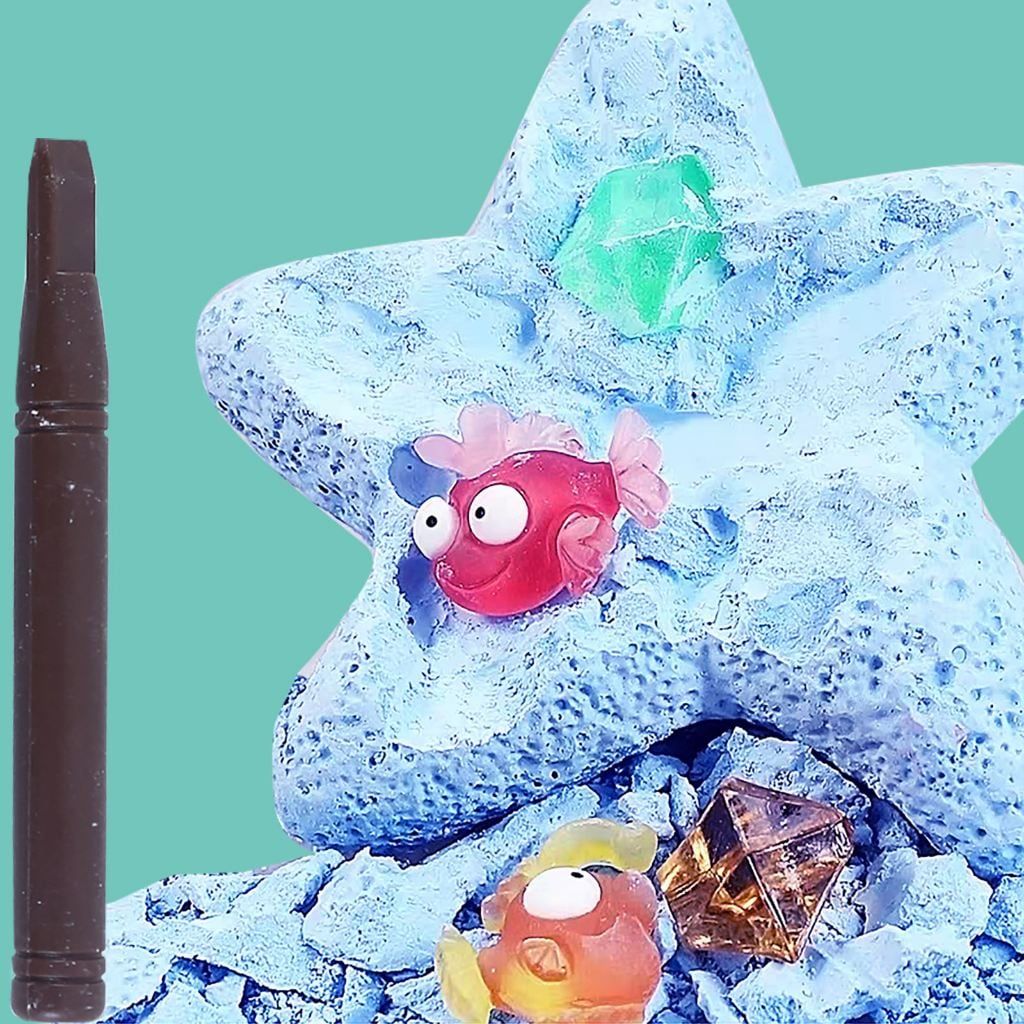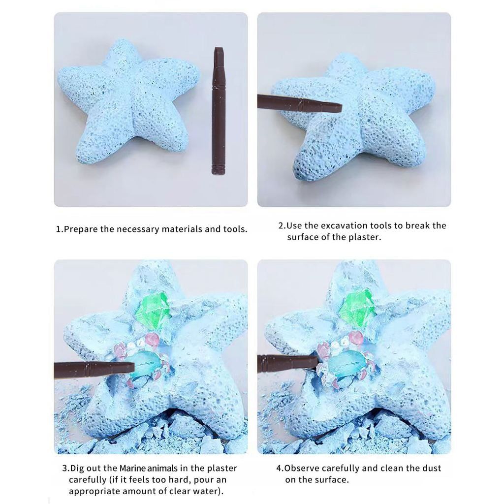 Bộ đồ chơi này giúp bé trải nghiệm cảm giác trở thành nhà thám hiểm đại dương. Bé sẽ tự tay "khai quật" và khám phá sinh vật biển bên trong khối thạch cao hình ngôi sao. Sản phẩm bao gồm: 1 khối thạch cao, 1 dụng cụ khai quật và 1-3 món đồ chơi sinh vật biển nhiều màu sắc. Bé sẽ đục nhẹ, quan sát và tìm ra các sinh vật bên trong.