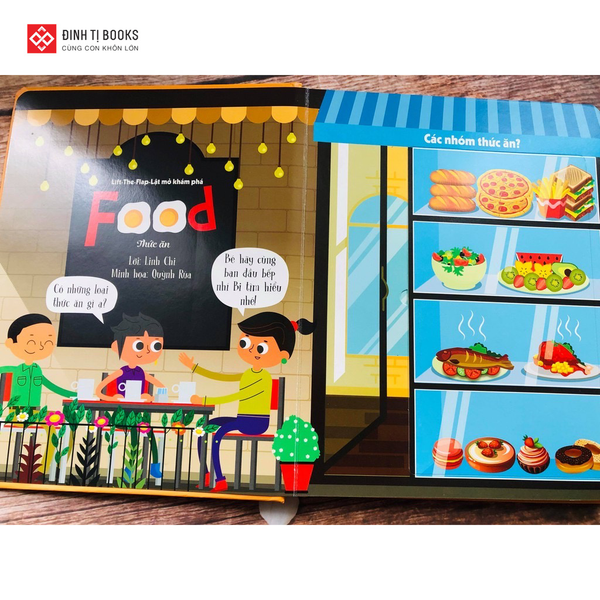 Lật! Lật! Lật! Bất ngờ thật. Bố mẹ và bé hãy MỞ cuốn sách này ra rồi LẬT những miếng ghép lên để cùng HỌC rất nhiều từ song ngữ Việt - Anh về thức ăn nhé! Sẽ cực kỳ vui và bổ ích đấy! Sách lật mở khám phá - Food - Thức ăn là loại sách đa tương tác dành cho trẻ ở lứa tuổi mầm non (từ 0-6 tuổi), giúp nâng cao khả năng sáng tạo và tư duy logic, giúp bé tạo ra những “tác phẩm” độc đáo mang cá tính riêng, rèn luyện khả năng ngôn ngữ linh hoạt, biết vận dụng ngôn ngữ thích hợp trong mỗi tình huống, rèn luyện thói quen sinh hoạt nề nếp và khoa học.