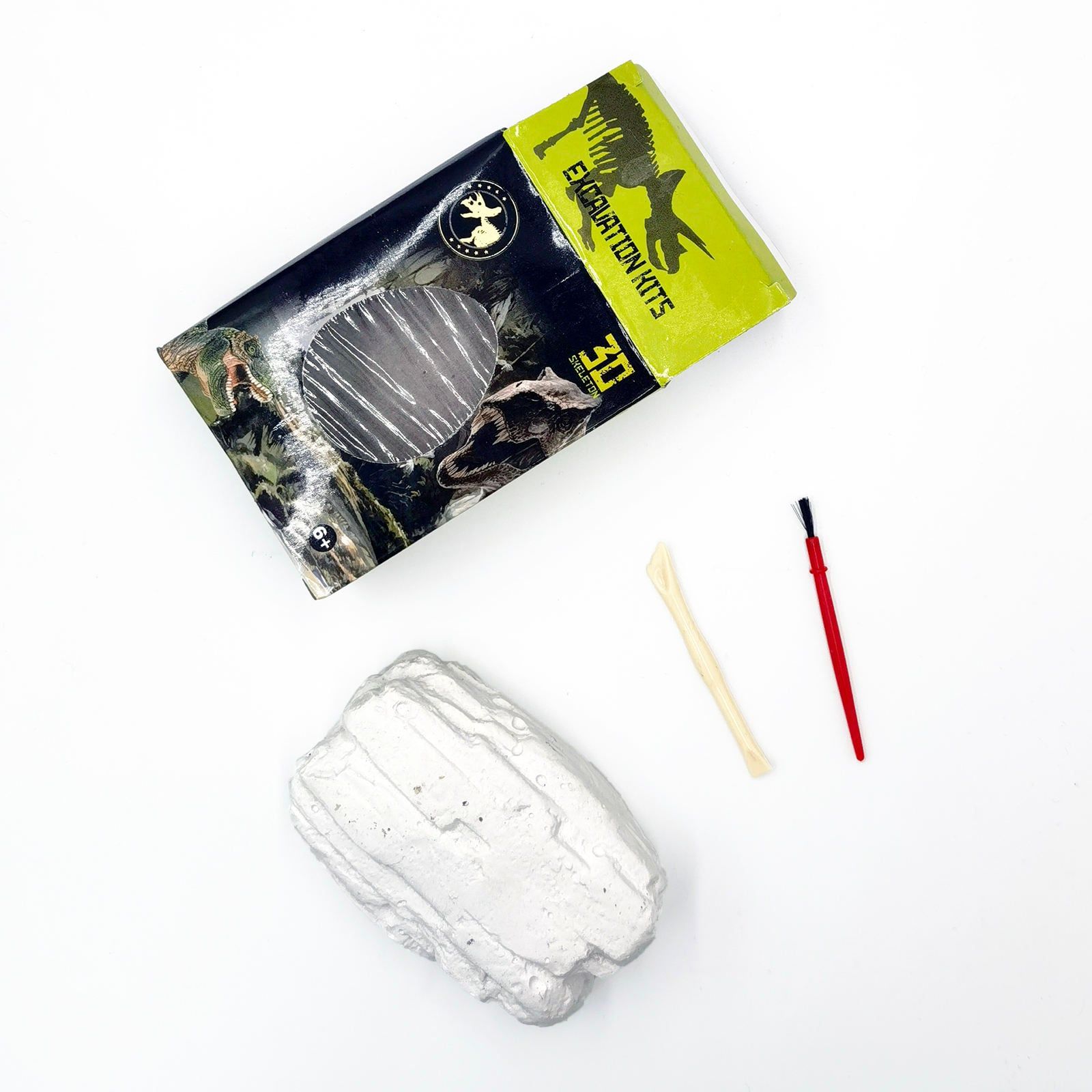 Phụ kiện: 1 khối đá hóa thạch, 1 mô hình khủng long, dụng cụ khai quật (búa/đục/chổi)