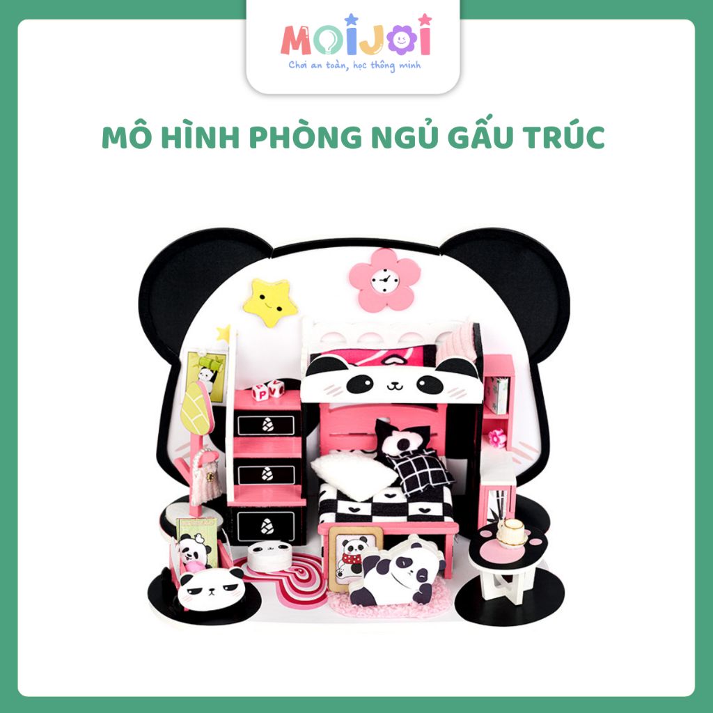 Bộ mô hình phòng ngủ mini lấy cảm hứng từ hình ảnh gấu trúc đáng yêu, phối màu trắng – đen – hồng nổi bật. Sản phẩm bao gồm giường tầng, bàn, ghế, tủ, cầu thang, giá sách và nhiều phụ kiện nhỏ xinh. Bé có thể tự tay lắp ráp, vừa vui chơi vừa phát triển khả năng sáng tạo và khéo léo.