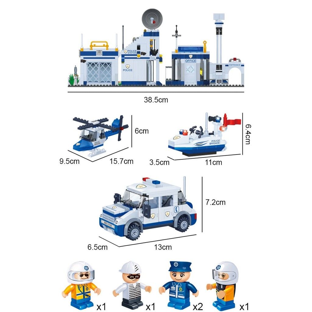 Đồ chơi lắp ráp Đồn Cảnh sát Police Station BanBao 8341 (718 chi tiết) là bộ xếp hình cỡ lớn thuộc dòng cảnh sát nổi tiếng của BanBao. Bộ sản phẩm mô phỏng trọn bộ đồn cảnh sát hiện đại gồm tòa nhà, xe tuần tra, trực thăng, phòng tạm giữ và nhiều nhân vật đi kèm, mang đến cho bé trải nghiệm nhập vai phong phú và hấp dẫn.