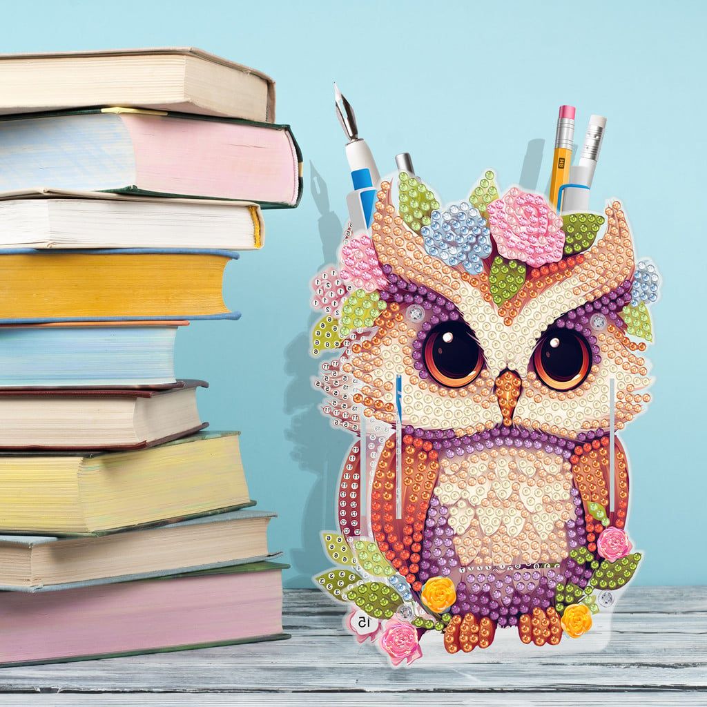 - Ống đựng bút hình Cú Mèo hoa láKích thước: 14.5 x 10 cmĐặc điểm: Hình cú mèo đôi mắt to tròn, đội vòng hoa pastel nhiều màu, họa tiết chi tiết và sống động.