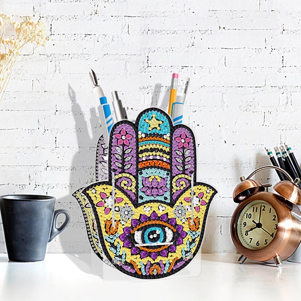 - Ống đựng bút hình Bàn Tay HamsaKích thước: 13.5 x 11.5 cmĐặc điểm: Biểu tượng bàn tay Hamsa nhiều màu, kết hợp họa tiết hoa và mắt may mắn, mang ý nghĩa bảo vệ.