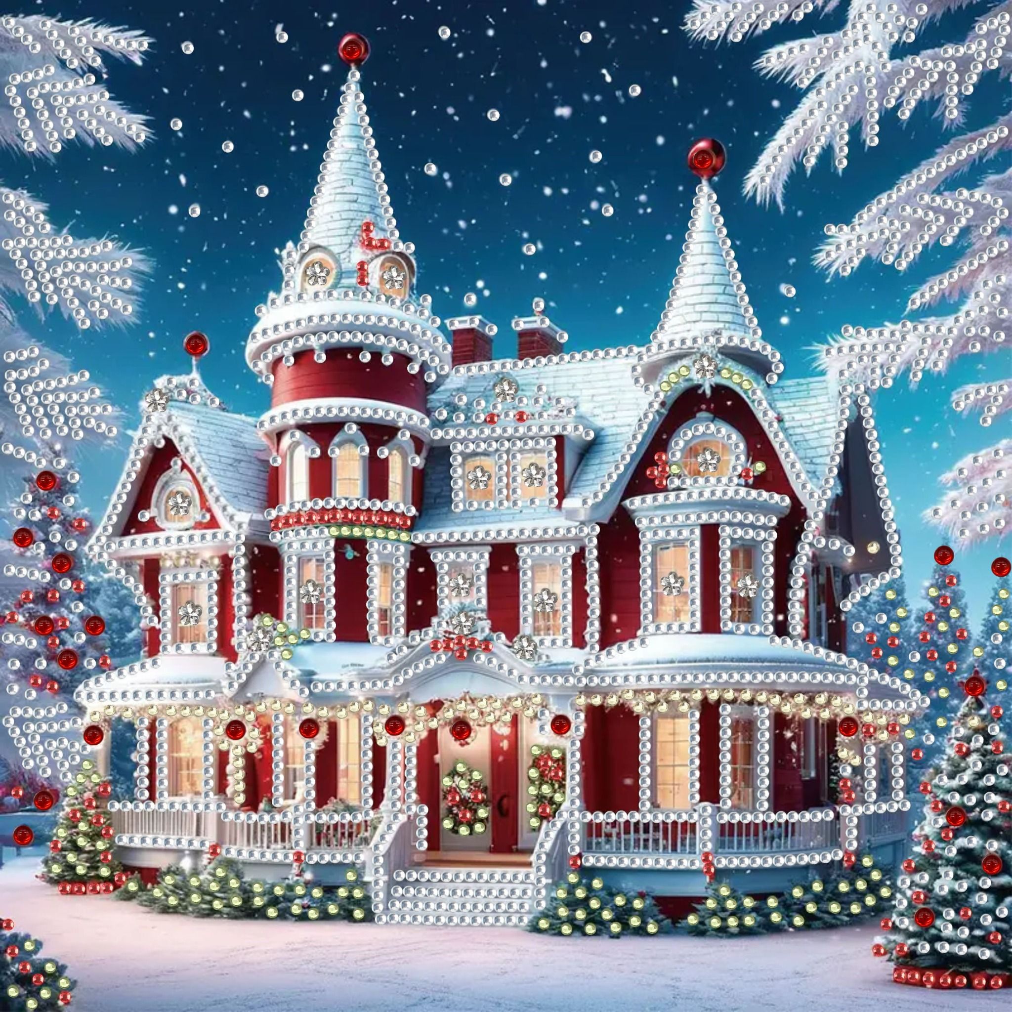 Tranh đính đá Noel ngôi nhà cổ tích mùa đông được thiết kế với hình ảnh một ngôi nhà phong cách châu Âu cổ điển, mái chóp phủ đầy tuyết trắng, bao quanh là cây thông Noel trang trí đèn vàng, quả châu đỏ rực rỡ và khung cảnh mùa đông lãng mạn. Toàn bộ bức tranh sử dụng kỹ thuật đính đá 5D tinh xảo, từng viên đá sáng bóng được đặt chuẩn xác, tạo nên hiệu ứng lấp lánh và sống động như thật.