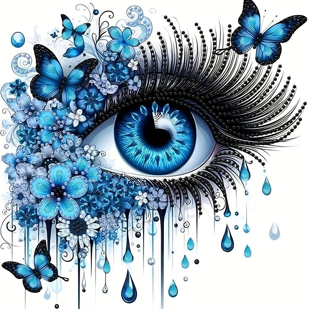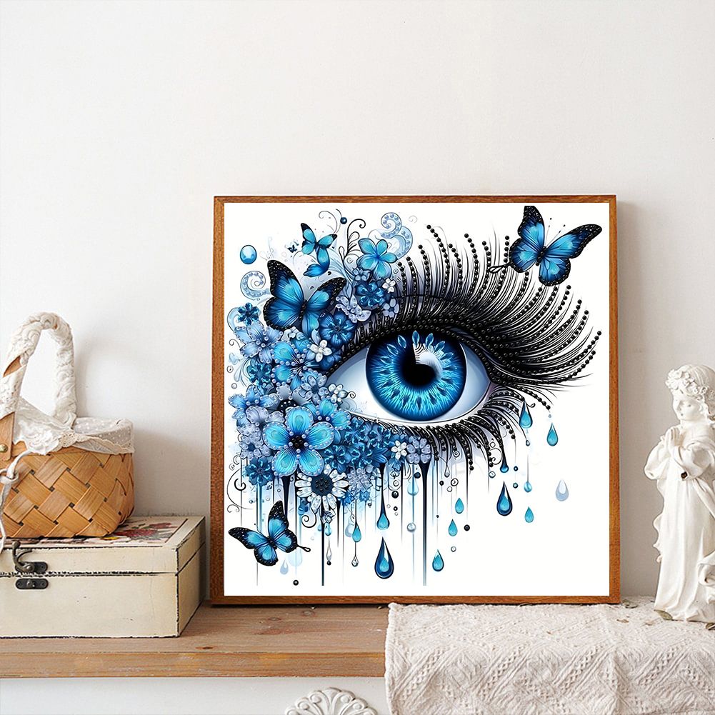 Tranh đính đá nghệ thuật hình đôi mắt xanh – Thiết kế 3D sống động, kèm bướm và hoa xanh, kích thước 30x30cm