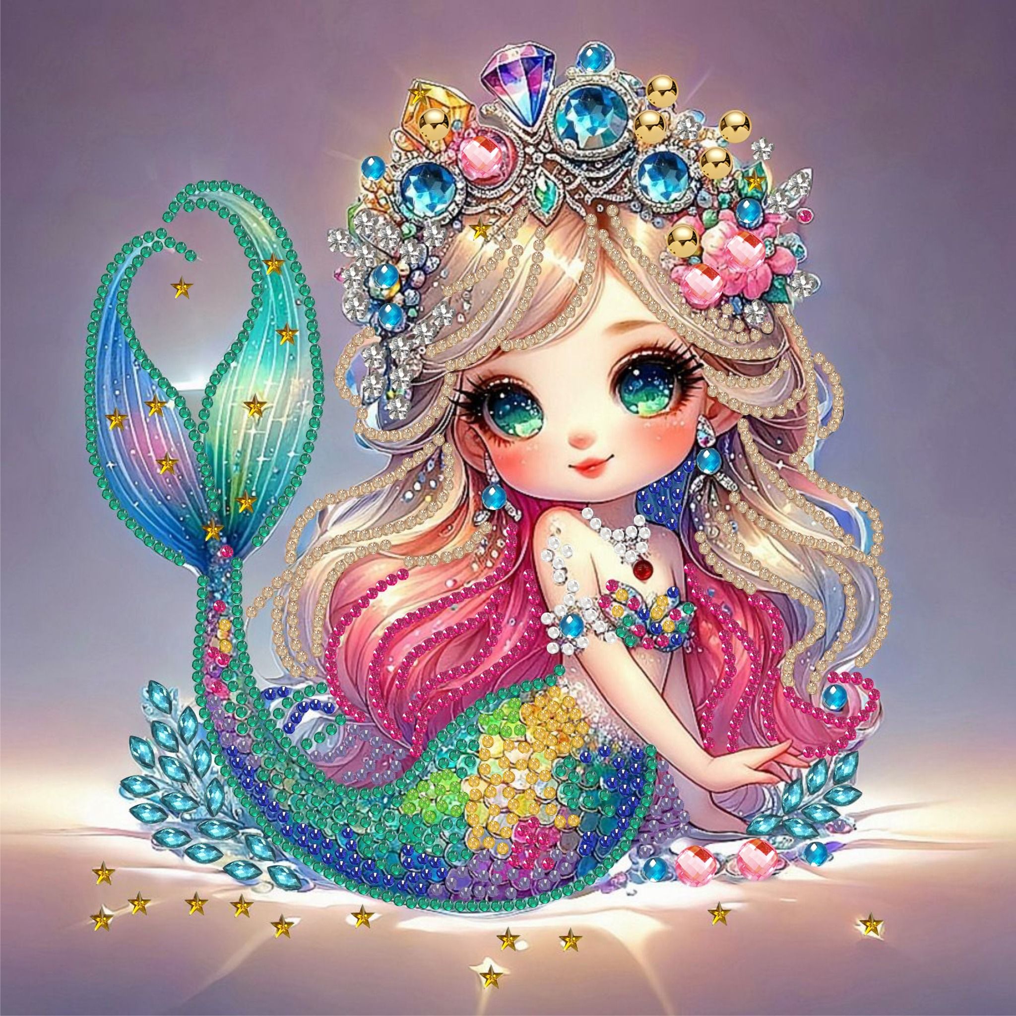 Bức Tranh đính đá 5D hình nàng tiên cá xinh đẹp với mái tóc bồng bềnh, đuôi cá nhiều màu rực rỡ và vương miện đá quý lấp lánh. Kích thước 30x30cm, là lựa chọn lý tưởng để trang trí nhà cửa hoặc làm quà tặng độc đáo.