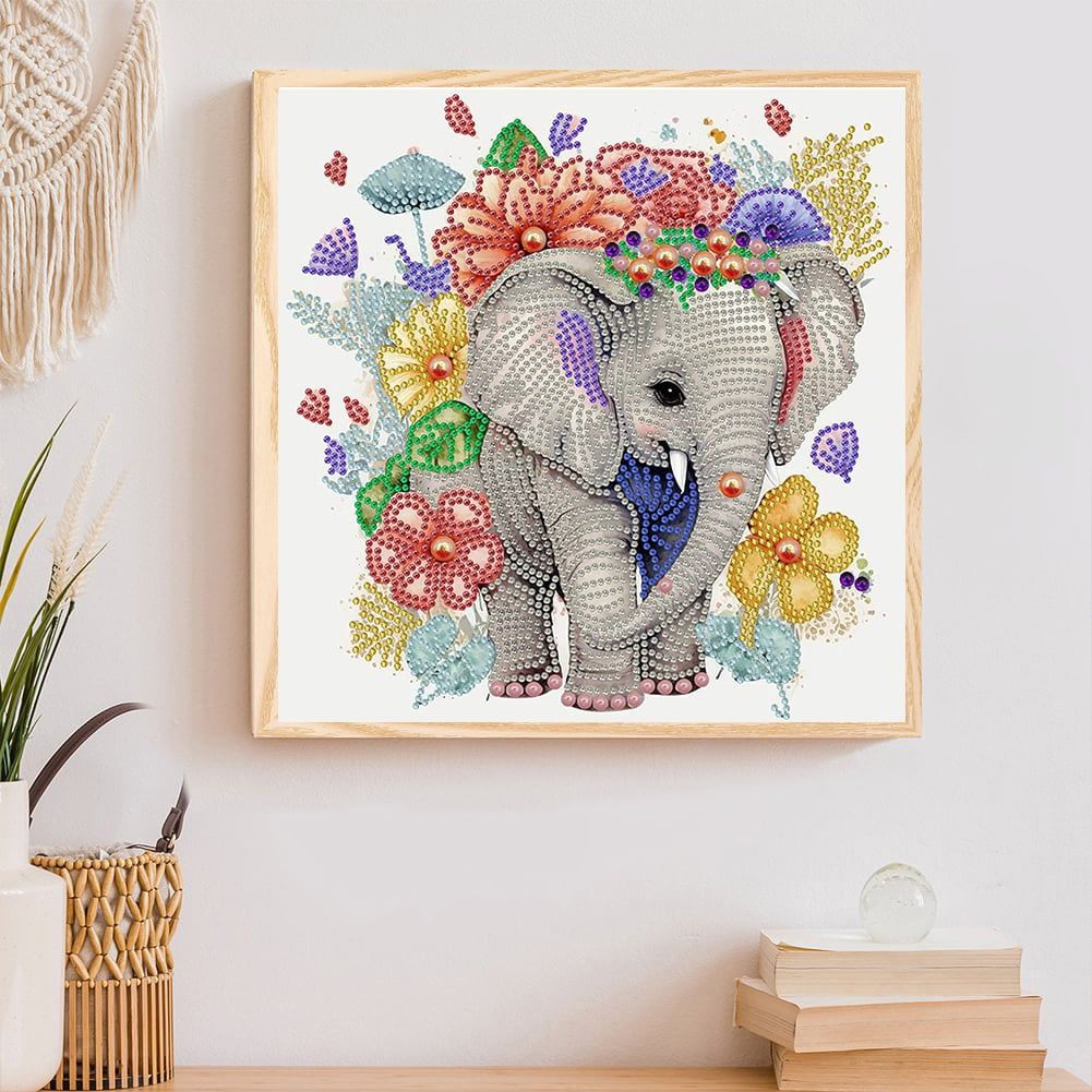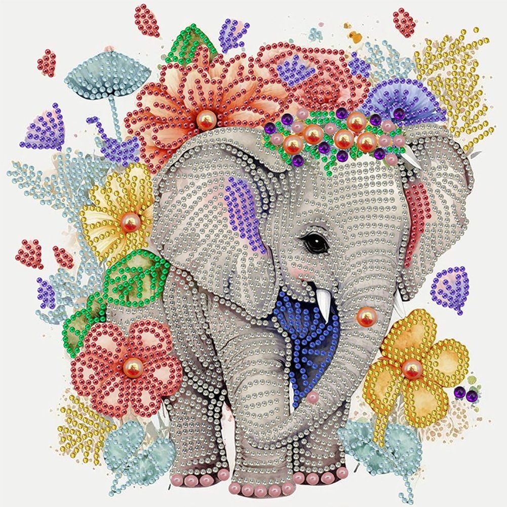 Tranh đính đá 5D hình voi con và hoa sắc màu – Kích thước 30x30cm, nguyên liệu cao cấp