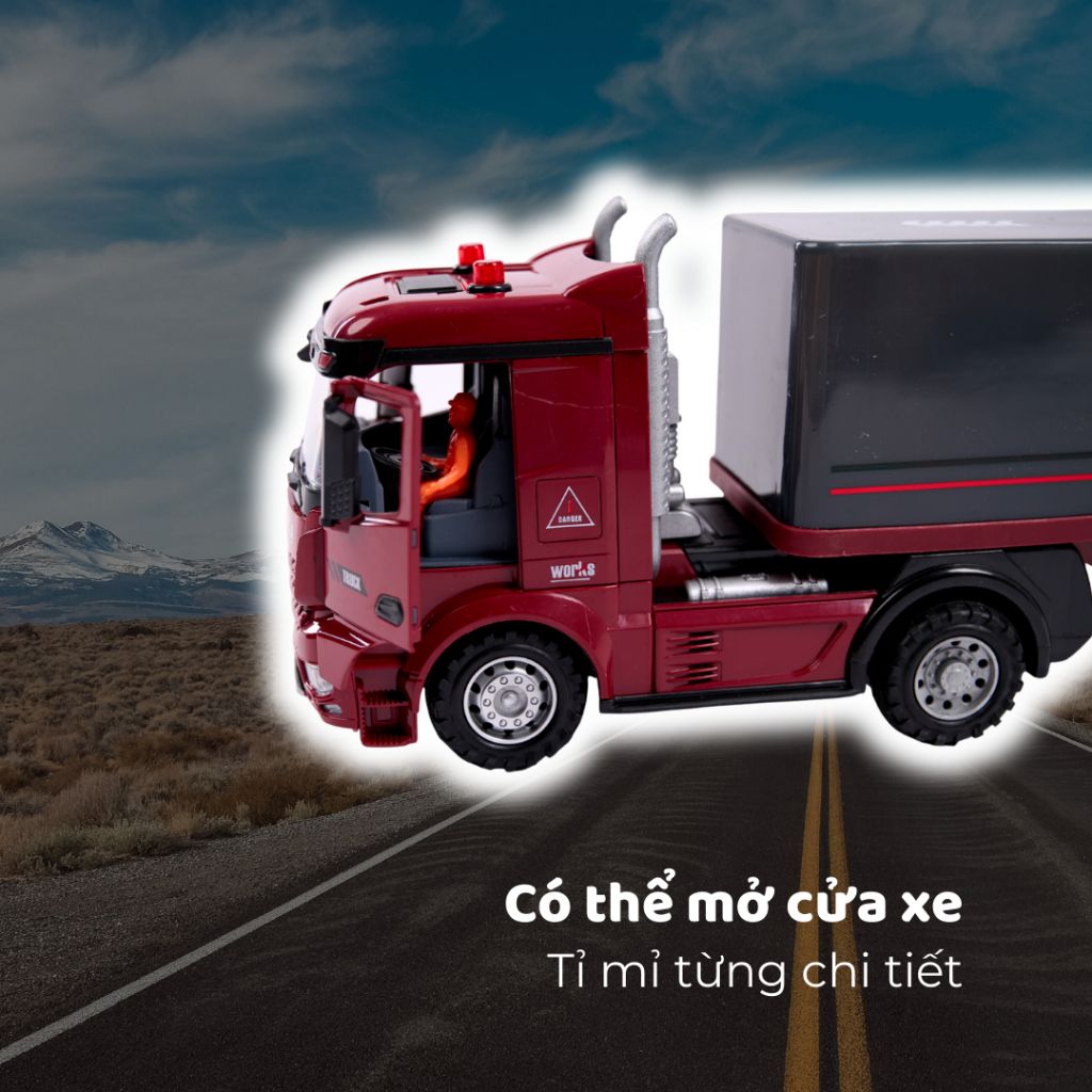 Mô hình Transport Truck sở hữu ngoại hình mạnh mẽ, thùng kéo dài 55 cm, mô phỏng chiếc xe vận tải hàng hóa với tỷ lệ đẹp mắt. Sản phẩm có đèn sáng và điều khiển tiến – lùi – rẽ, mang đến trải nghiệm chơi thú vị cho bé.