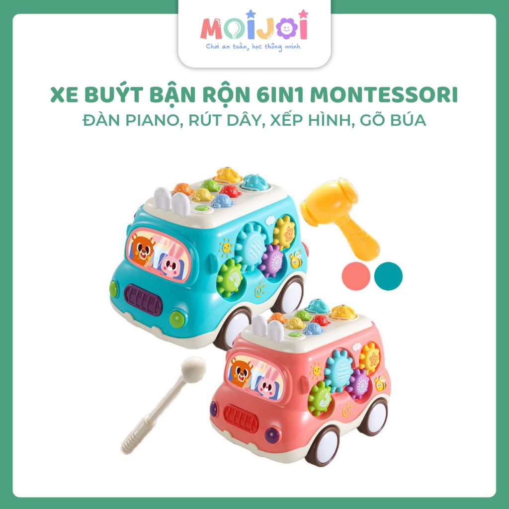 Xe buýt bận rộn 6 trong 1 Montessori Baby Toys – có đàn piano, rút dây, xếp hình, gõ búa